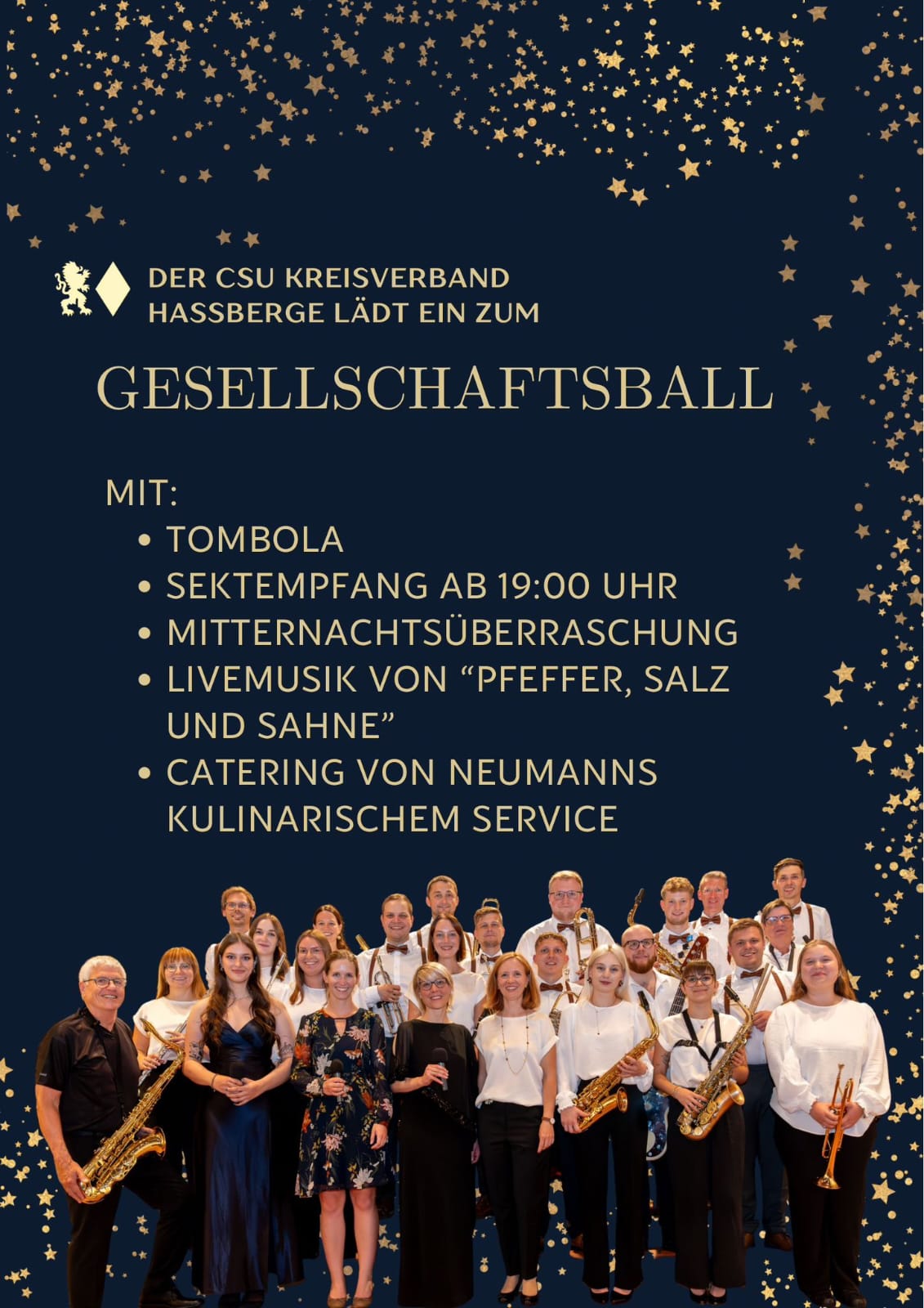 An die langen Tradition vergangener Jahre knüpft auch der Gesellschaftsball 2026 der CSU wieder an! Mit großer Tombola, Sektempfang ab 19.00 Uhr, Mitternachtsüberraschung und Livemusik vom Feinsten mit "Pfeffer, Salz und Sahne" (siehe Bild) starten wir gemeinsam mit unserem Schirmherrn und Landratskandidaten Michael Ziegler am 10. Januar 2026 in das neue Jahr! Seien Sie dabei und sichern Sie sich rechtzeitig eine Karte!